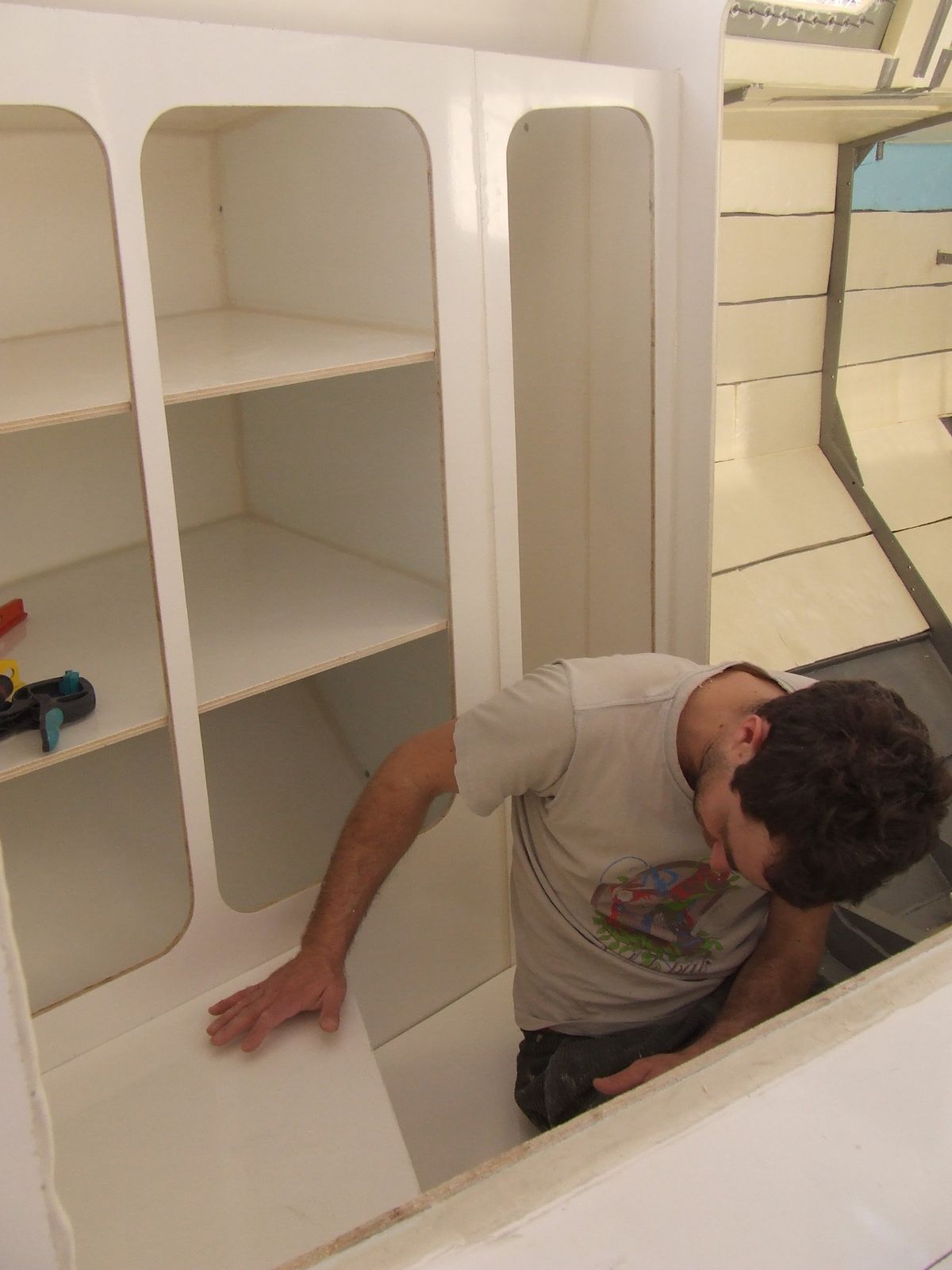 Nous sommes contents d’avoir une cabine spacieuse, lumineuse et avec une grande couchette double. Un panneau de pont, deux aérateurs et deux petits hublots, assureront une très bonne aération de la cabine. Elle offre de grands espaces de rangements : 4 coffres, un placard et une penderie. La coque remonte vers l'arrière alors Pierre a construit un plancher en forme d'escalier : il est divisé en trois niveaux.