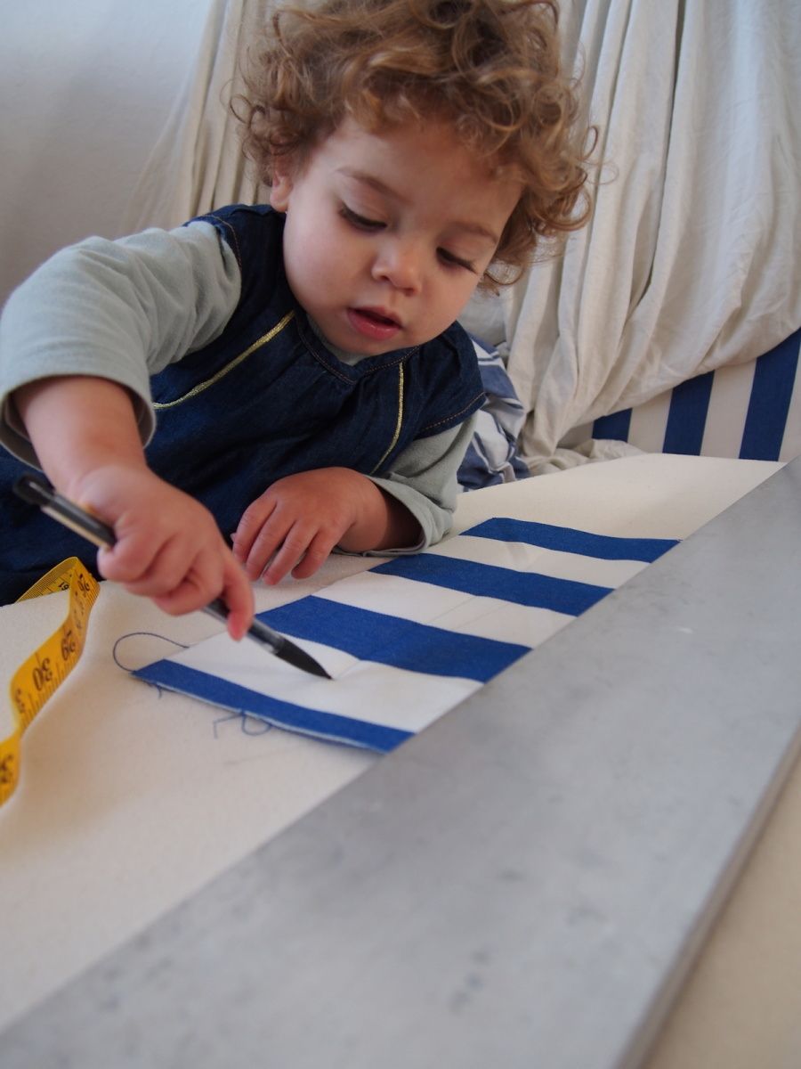 Si c'était à refaire, je choisirais un tissu uni. Les rayures bleu marines sont très jolies mais cela donne beaucoup plus de travail pour être raccord entre les différentes parties du matelas et produit plus de chutes de tissu aussi.