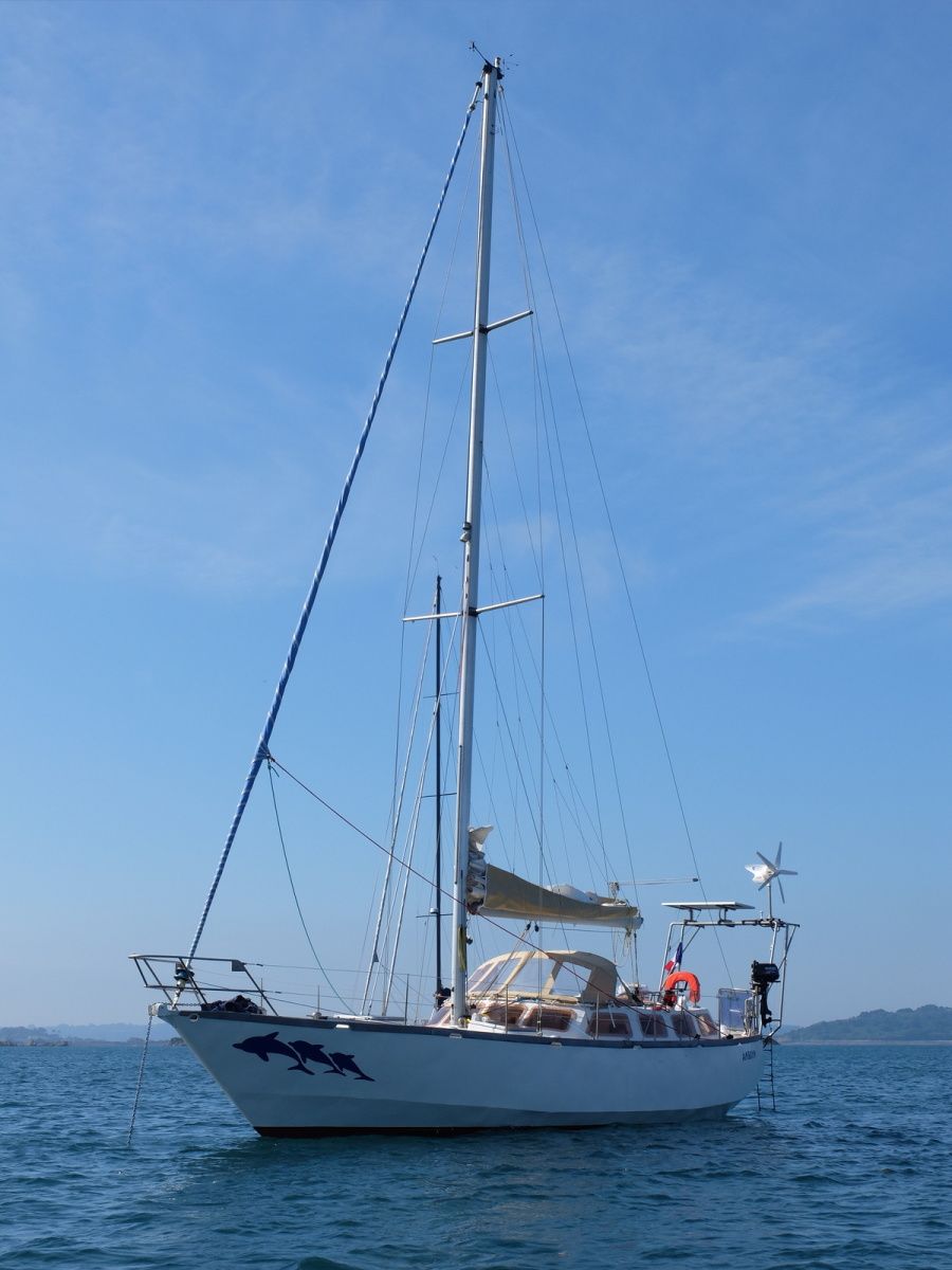 Gilles, constructeur amateur lui même, a réalisé la décoration de notre étrave. Trois dauphins, un pour chaque moussaillon, qui placent notre voyage sous les meilleurs hospices.